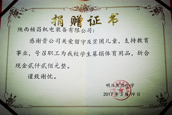 “傾心公益,傳遞愛心”,多年來,核昌公司干部職工一直熱心于公益事業(yè),主動(dòng)發(fā)揚(yáng)雷鋒精神。此次,核昌公司團(tuán)委通過組織職工為留守兒童募捐,希望在校學(xué)生提高鍛煉身體的意識(shí),幫助他們健康成長。受捐學(xué)校舉行了捐贈(zèng)儀式,表達(dá)了對核昌公司職工的感激之情,并為公司贈(zèng)予了榮譽(yù)證書。